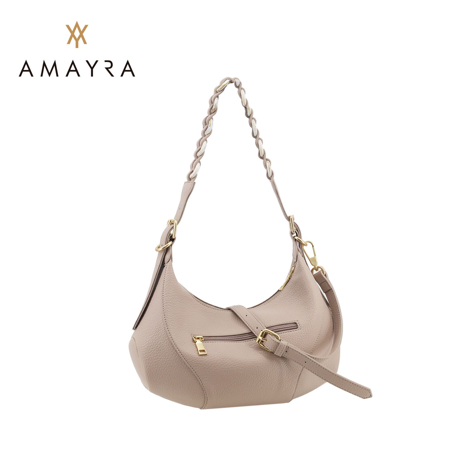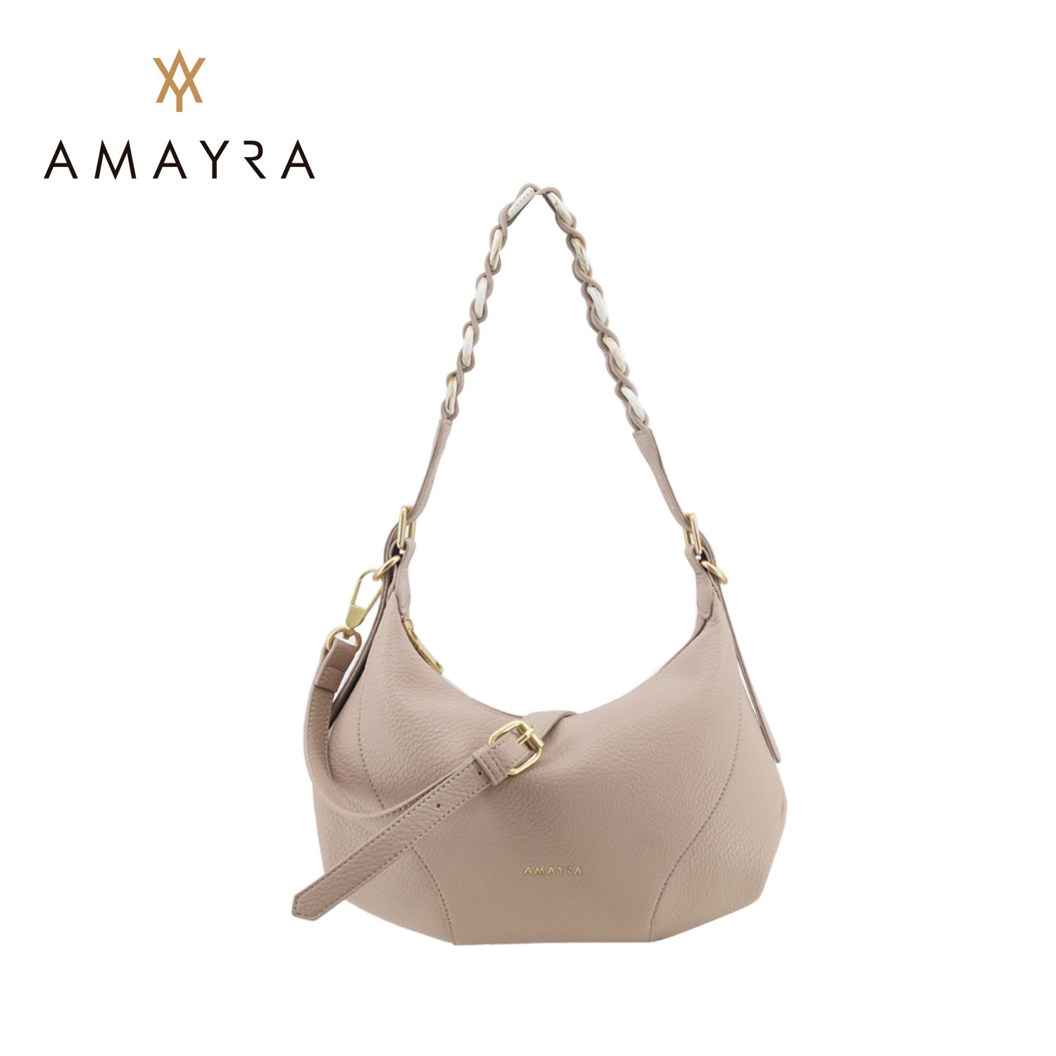 Su formato curvo tipo hobo bag y el detalle de manija trenzada con herrajes dorados la convierten en una pieza única.