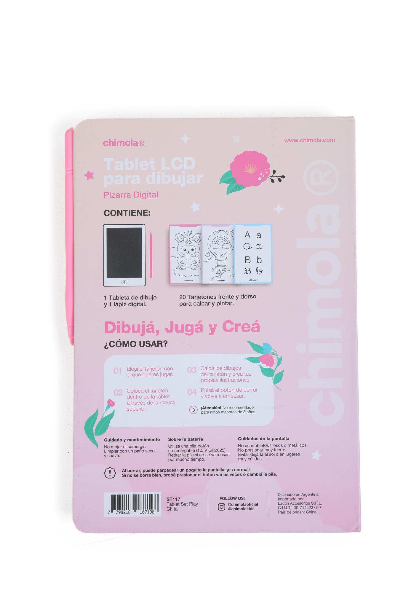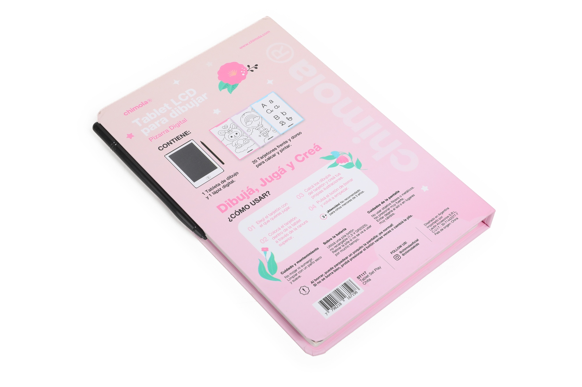 Descripción: TABLET LCD PARA DIBUJAR MEDIDAS: 22*15.5*1.9CM CONTIENE: - 1 TABLETA DE DIBUJO - 1 LÁPIZ DIGITAL - 20 TARJETONES FRENTE Y DORSO PARA CALCAR Y PINTA