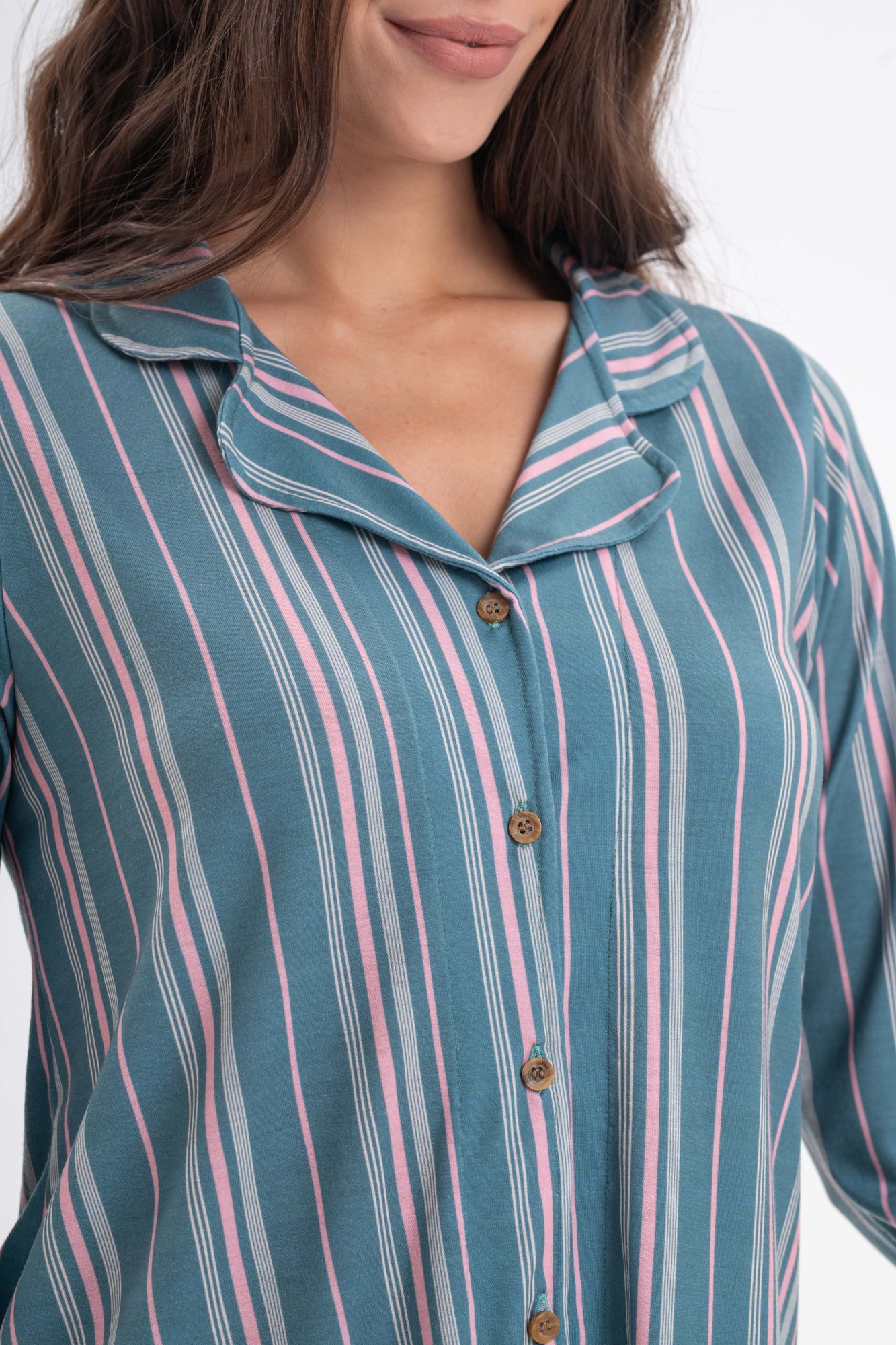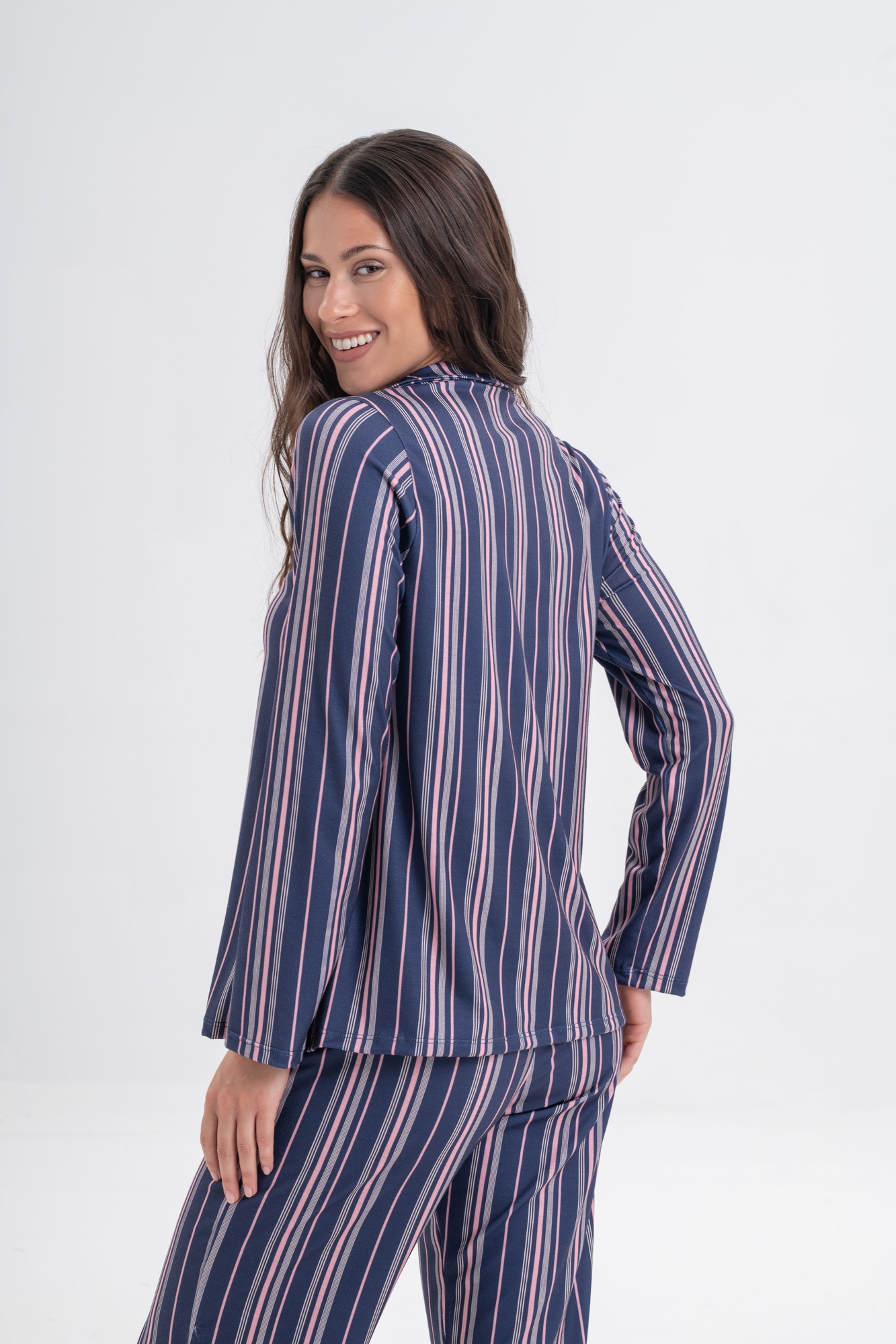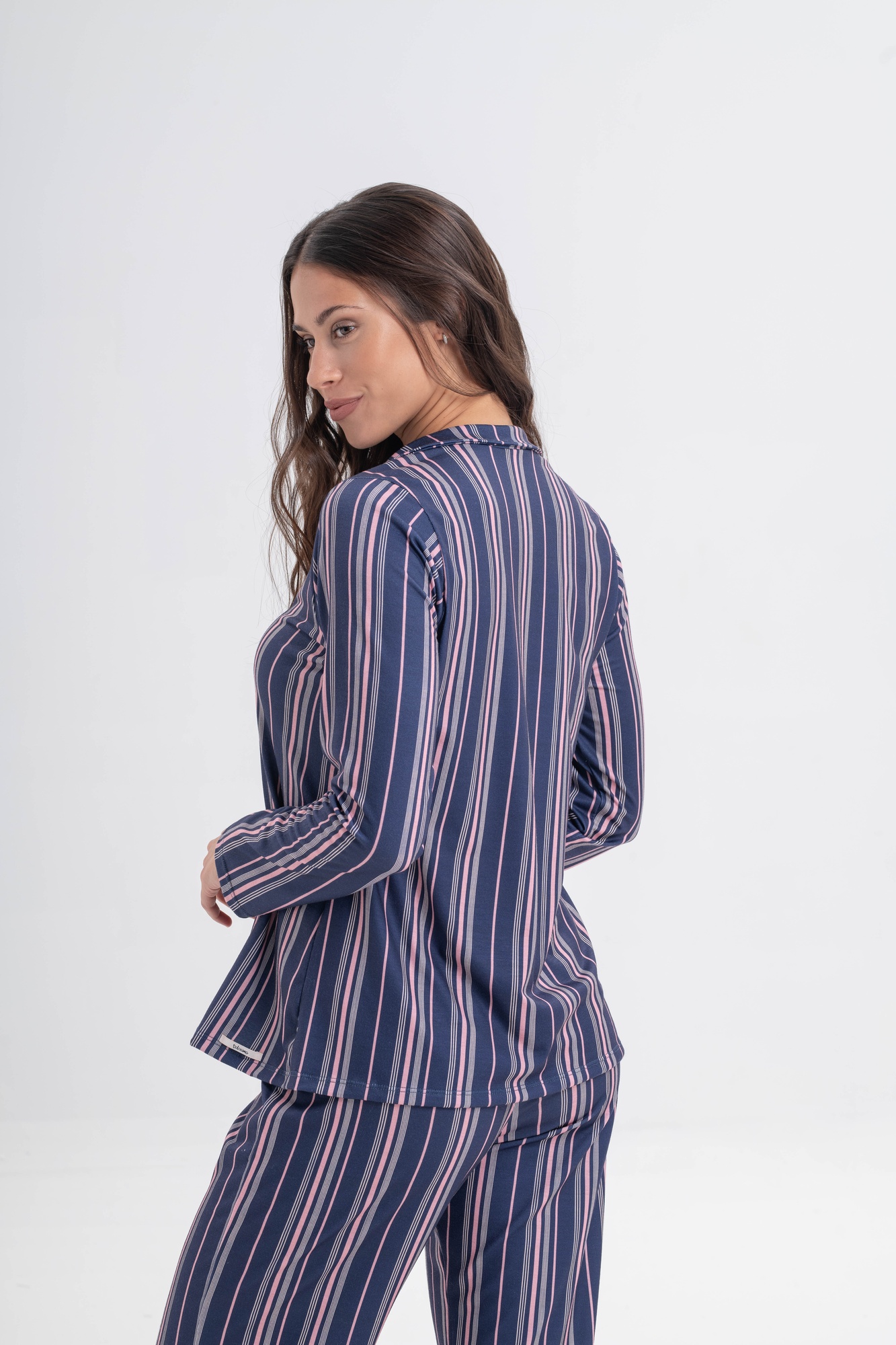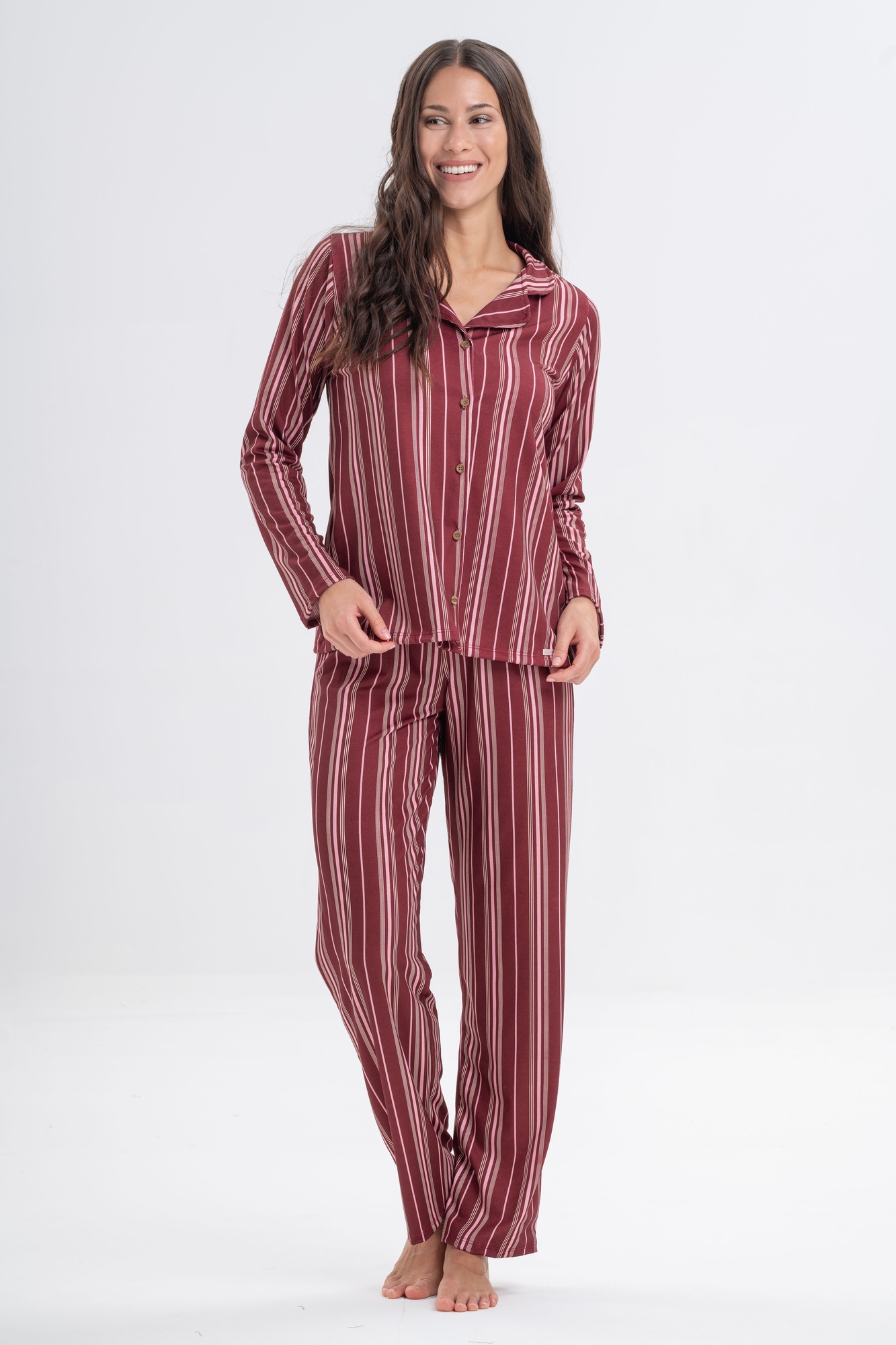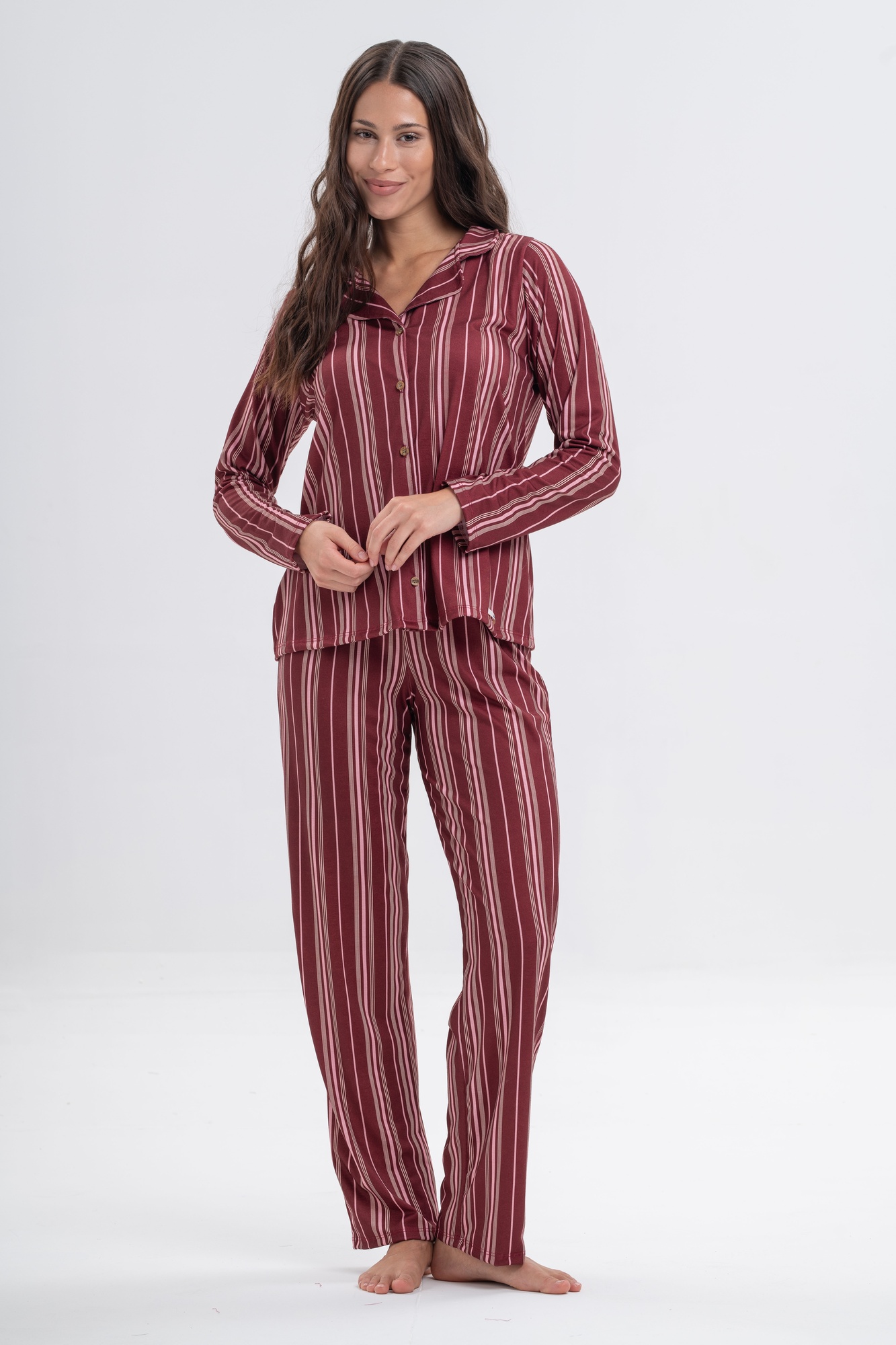 Conjunto de dos piezas: camisa manga larga con botones frontales y cuello clásico, combinada con pantalón largo de calce cómodo.