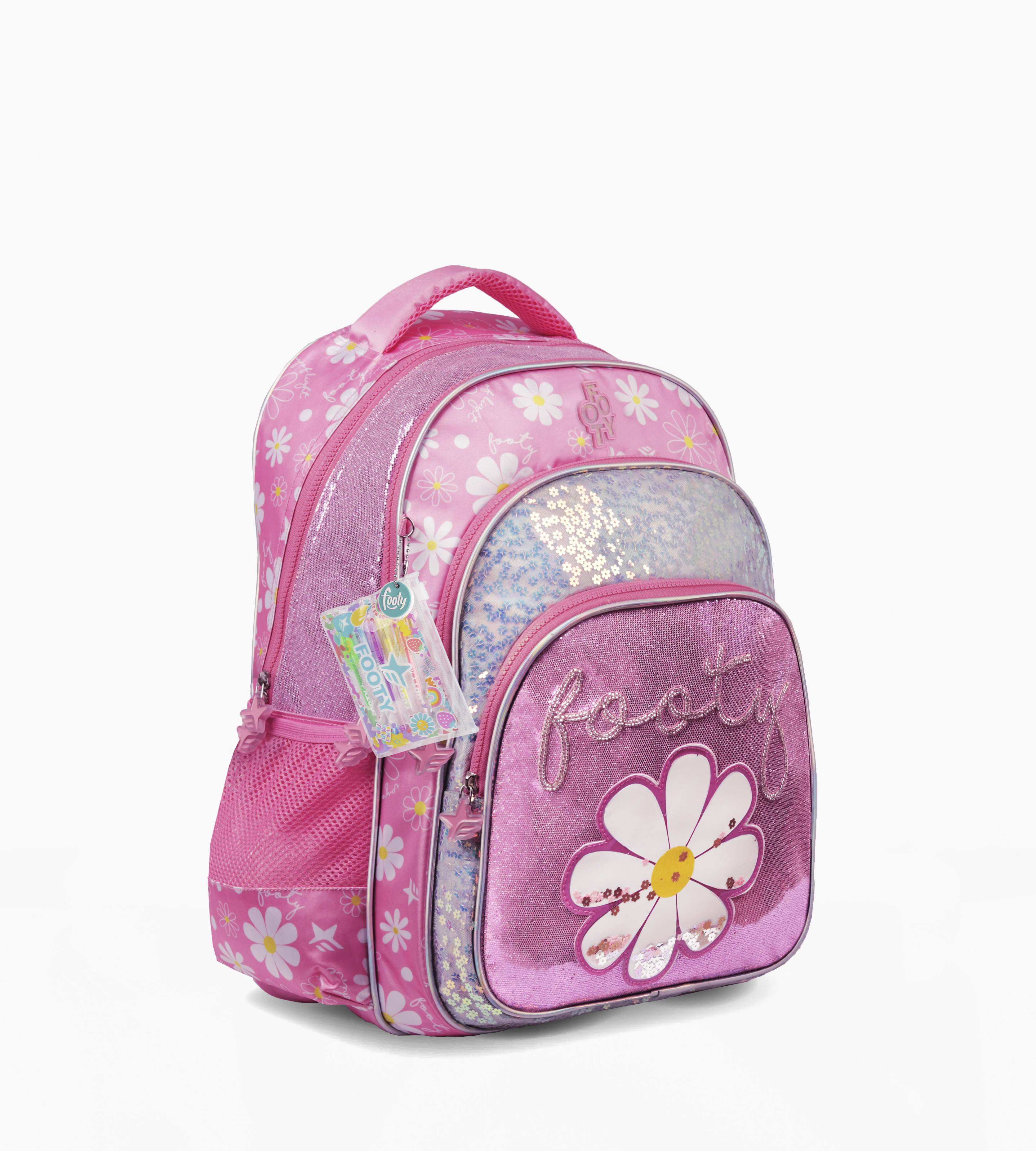 Estampa sublimada, tela con efecto tornasol y lentejuelas con mini de flores en holograma
