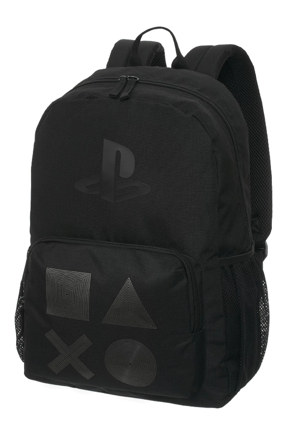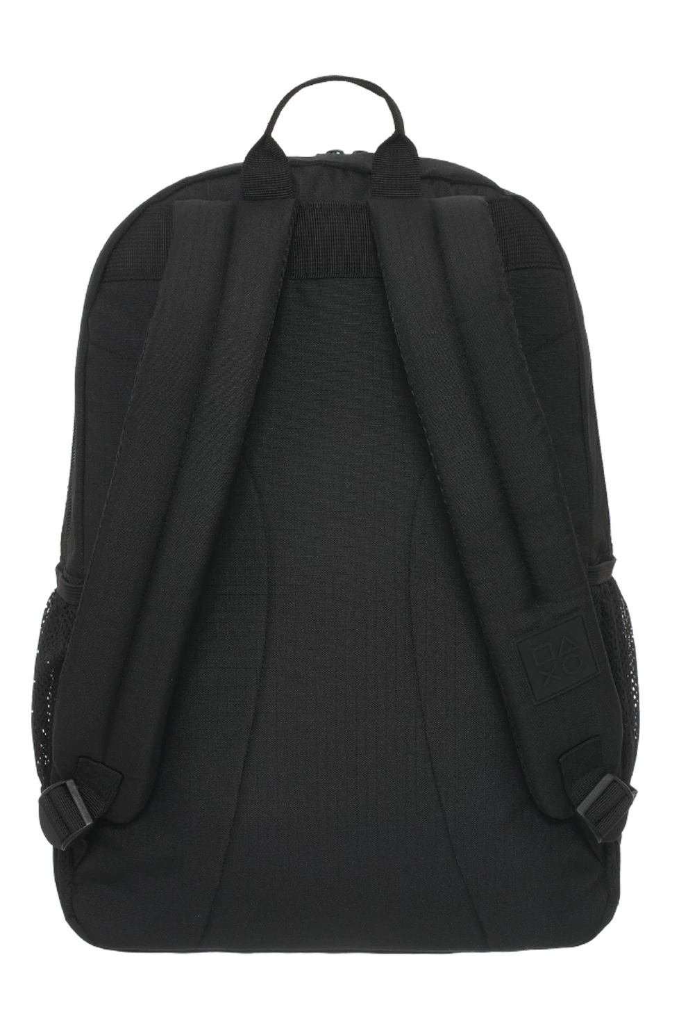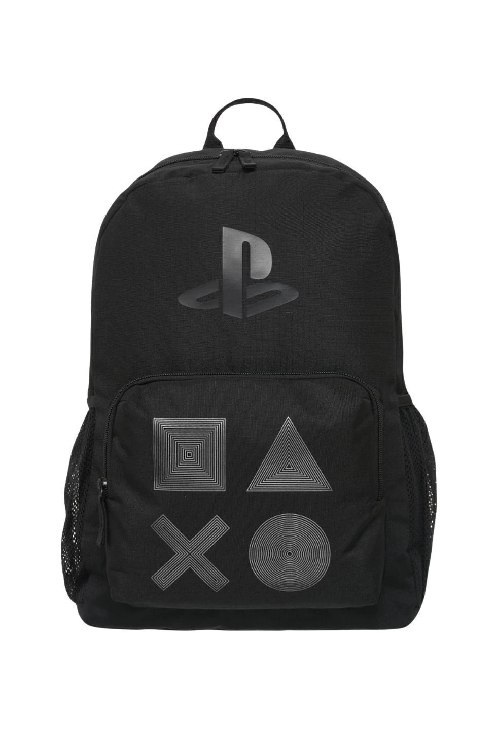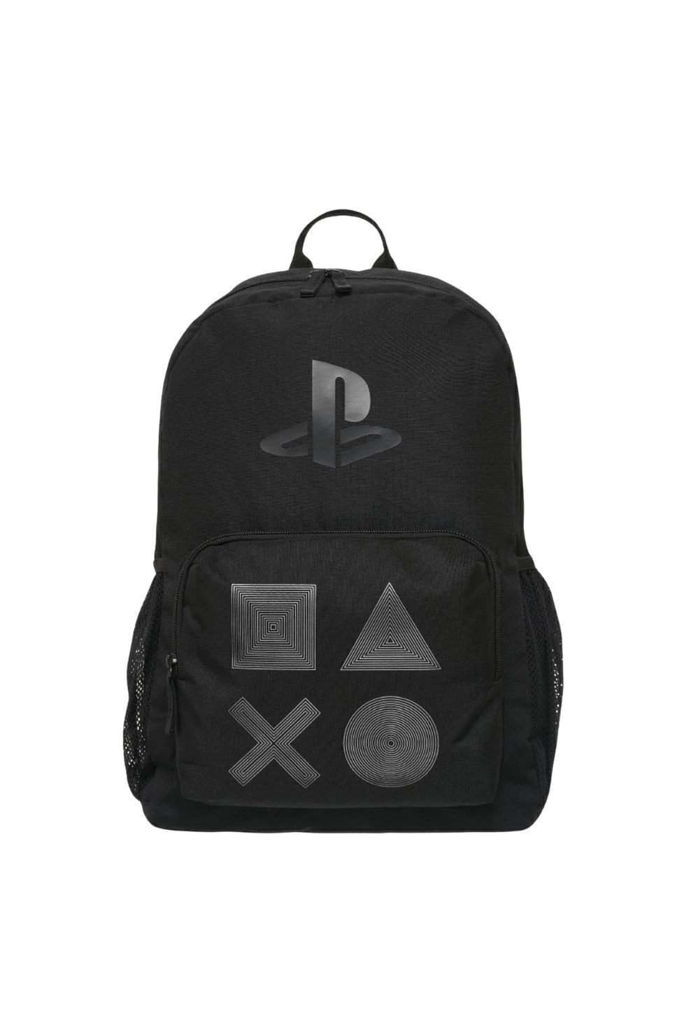 Descripción: Descripción Mochila PlayStation ALL BLACK Original con Licencia Sony. Colección confeccionada en poliéster engomado con logo estampado. Compartimento principal y bolsillo frontal con cierre de plástico a tono. Tiradores de plástico rígido. Bolsillo laterales abiertos. Espalda acolchada con goma espuma y correa regulable. Medidas Aproximadas: Altura:44 cm. Ancho:28 cm. Base:14 cm.