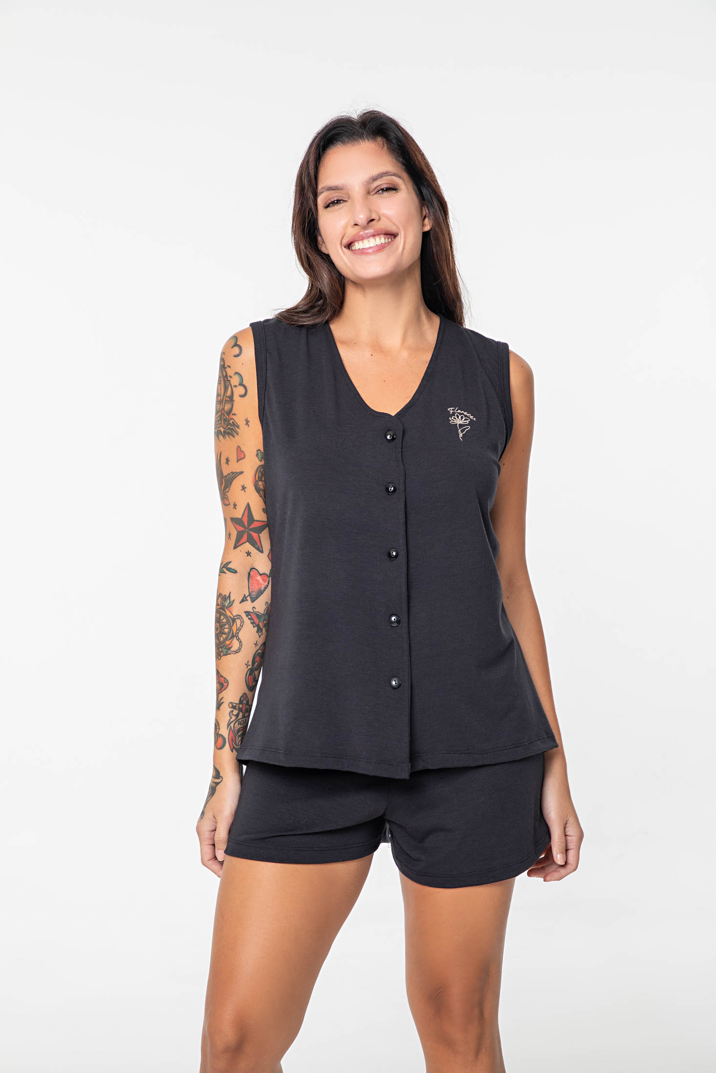Pijama en Modal. Camiseta escote en V, sin mangas, con botones. Detalle bordado a un lado del pecho. Short con elástico cintura.